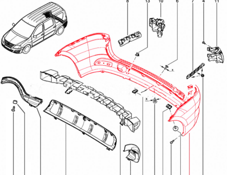 - 8450091529 Бампер задний без отверстий под датчики парковки тисненый пластик (шагрень) без покраски