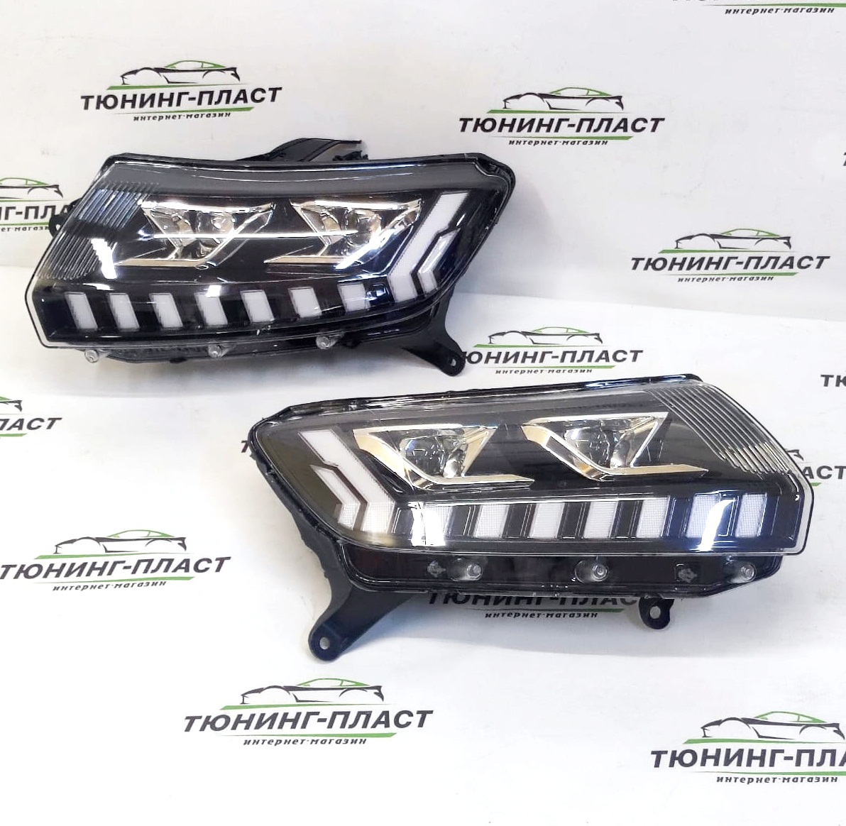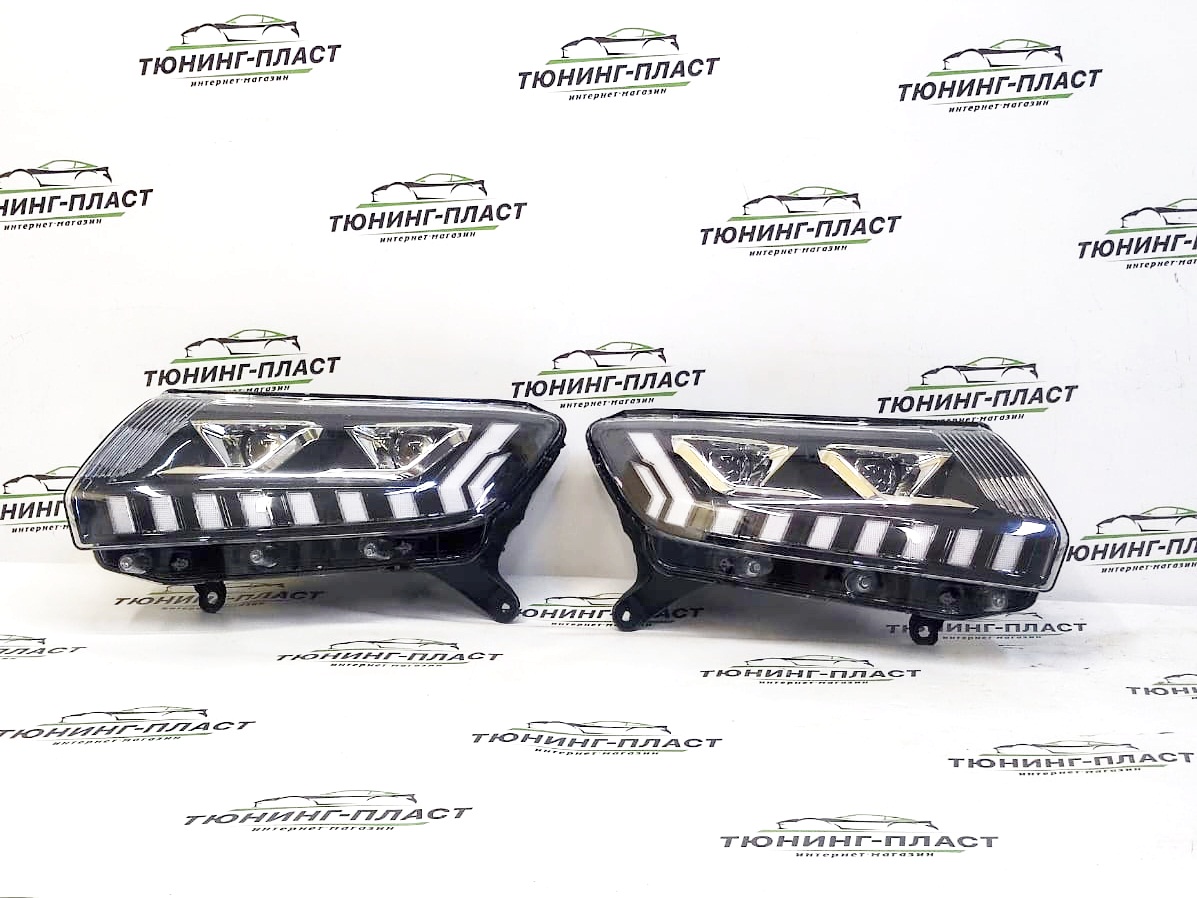 Передние фары в стиле Audi с двумя би-LED линзами, динамическим розжигом ДХО и поворотниками предназначены для Лада Ларгус FL.